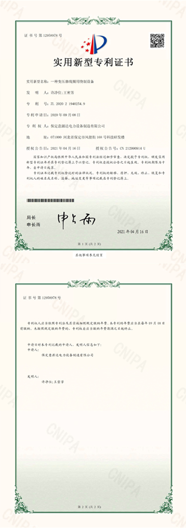 一種變壓器線圈用繞制設備、ZL-2020-2-1940254.9 | 一種變壓器智能終端、ZL-2019-2-2319252.1 | |