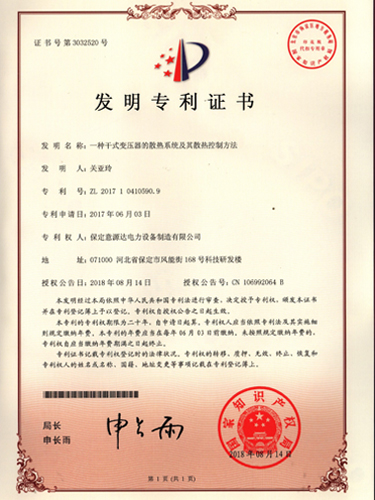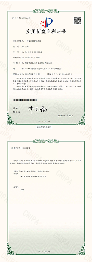 一種變壓器智能終端、ZL-2019-2-2319252.1 | 一種改進型干式變壓器防護外殼結(jié)構(gòu)、ZL-2020-2-1980333.2 | |