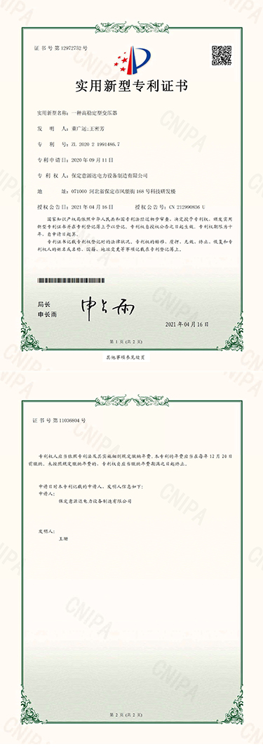 一種高穩(wěn)定型變壓器、ZL-2020-2-1991486.7 | 一種減震效果好的變壓器結(jié)構(gòu)、ZL-2020-2-1939005.8 | |