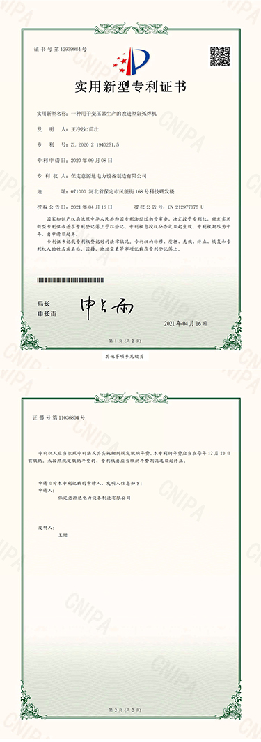 一種用于變壓器的烘干控制箱、ZL-2020-2-1939555.X | 一種用于變壓器生產(chǎn)的改進型氬弧焊機、ZL-2020-2-1940251.5 | |